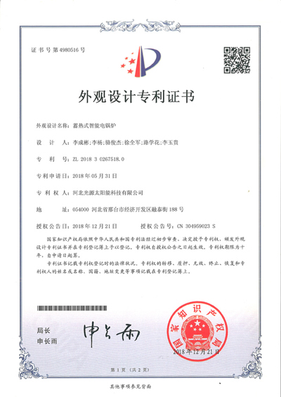 外觀設(shè)計專利證書--蓄熱式智能電鍋爐
