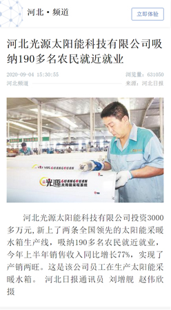 新華社報(bào)道說:“河北光源太陽能科技有限公司投資3000多萬元,新上了兩條全國(guó)領(lǐng)先的太陽能采暖水箱生產(chǎn)線,吸納190多名農(nóng)民就近就業(yè),今年上半年銷售收入同比增長(zhǎng)77%,實(shí)現(xiàn)了產(chǎn)銷兩旺。”